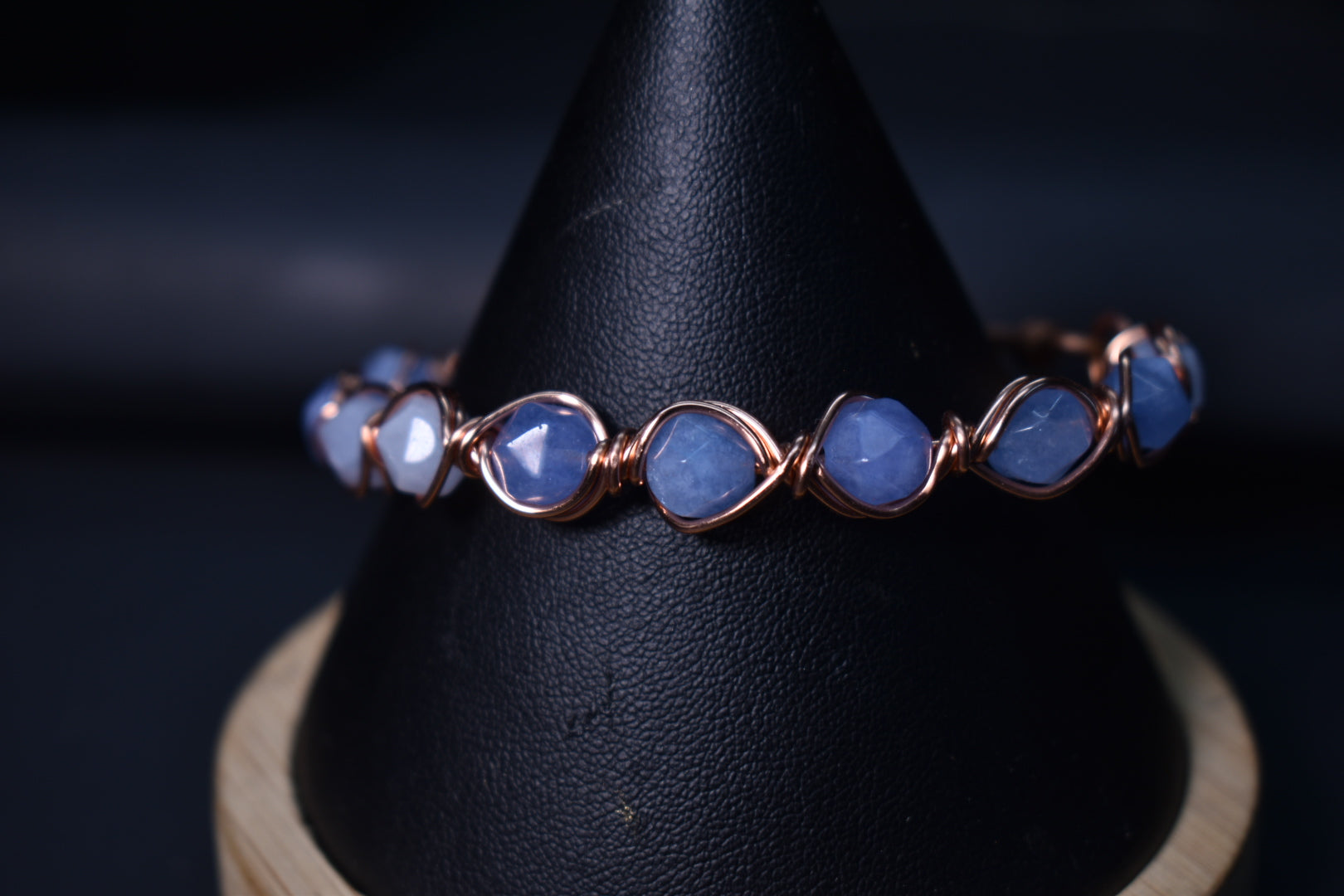 This bracelet is crafted from hand-woven copper wire, shaped into flowing coils that create a rhythmic, wave-like pattern around each central bead. Its design embodies motion and harmony, with each loop of wire reinforcing both structure and style. The interlaced wrapping technique gives the piece a dynamic energy, as if the bracelet itself were pulsing with resonance. Strong yet fluid, it balances durability with artistry, making it a timeless adornment that channels both elegance and strength.
