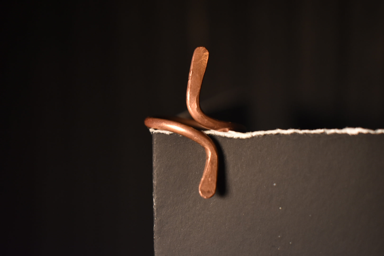 Hand-formed with intention, each bend and taper creates a subtle directional energy, like a cosmic current traveling up and down the spine. Its open-ended shape wraps the finger like a whispered incantation: grounded, aligned, and aware of the forces moving both within and beyond.