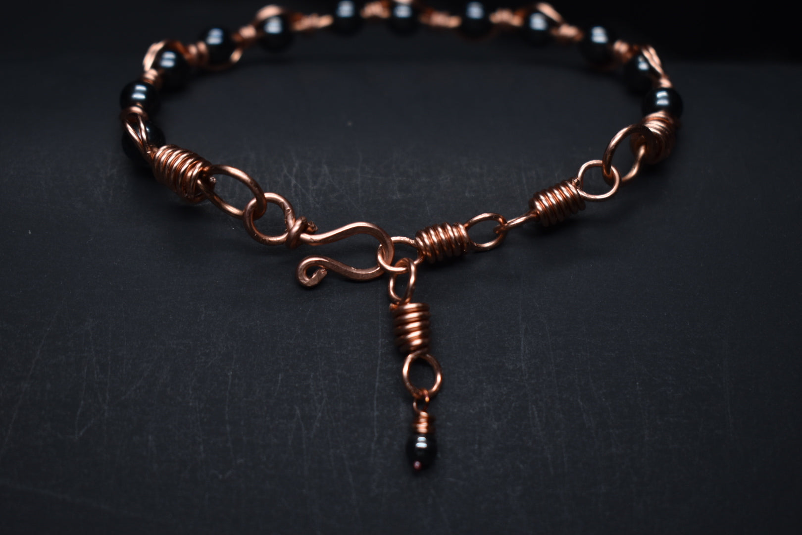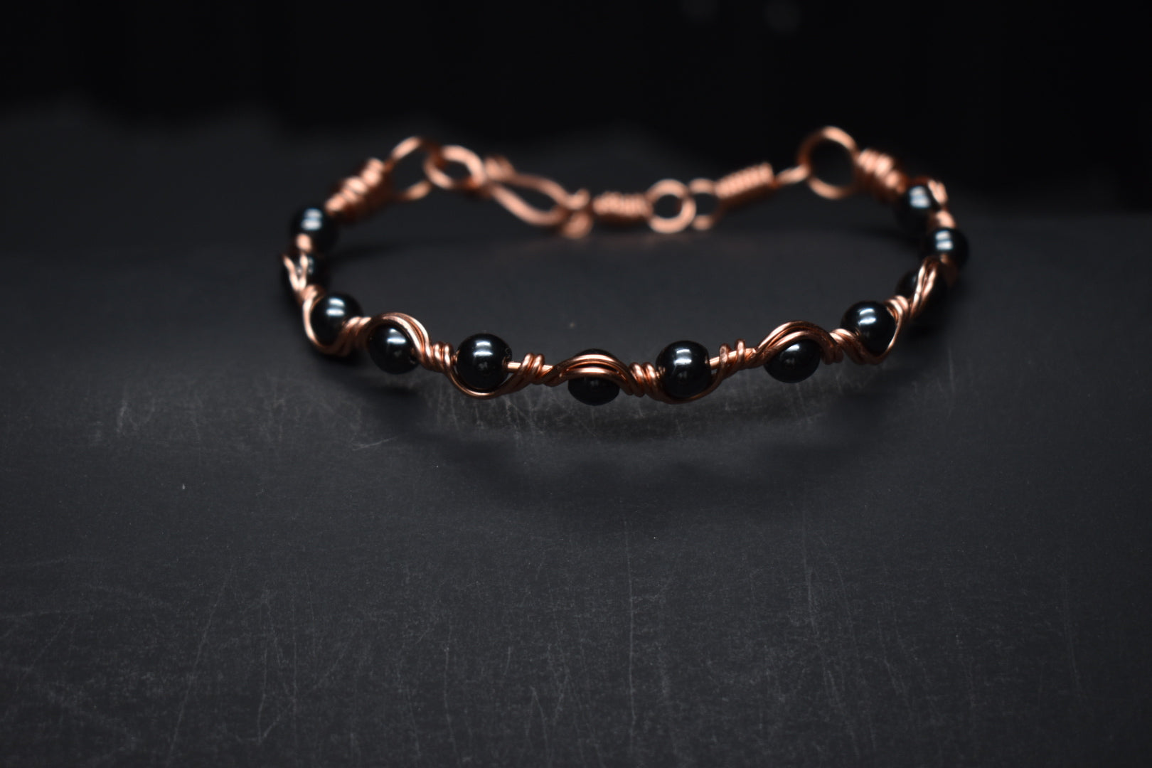 This bracelet is crafted from hand-woven copper wire, shaped into flowing coils that create a rhythmic, wave-like pattern around each central bead. Its design embodies motion and harmony, with each loop of wire reinforcing both structure and style. The interlaced wrapping technique gives the piece a dynamic energy, as if the bracelet itself were pulsing with resonance. Strong yet fluid, it balances durability with artistry, making it a timeless adornment that channels both elegance and strength.