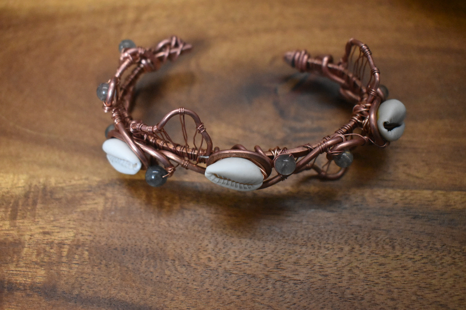 Cowrie shells, sacred vessels of protection and fertility, are woven into the flowing copper framework, mirroring the celestial streams that traverse the heavens. Labradorite stones glisten among the coils, guarding hidden pathways and illuminating the unseen crossings between realms.