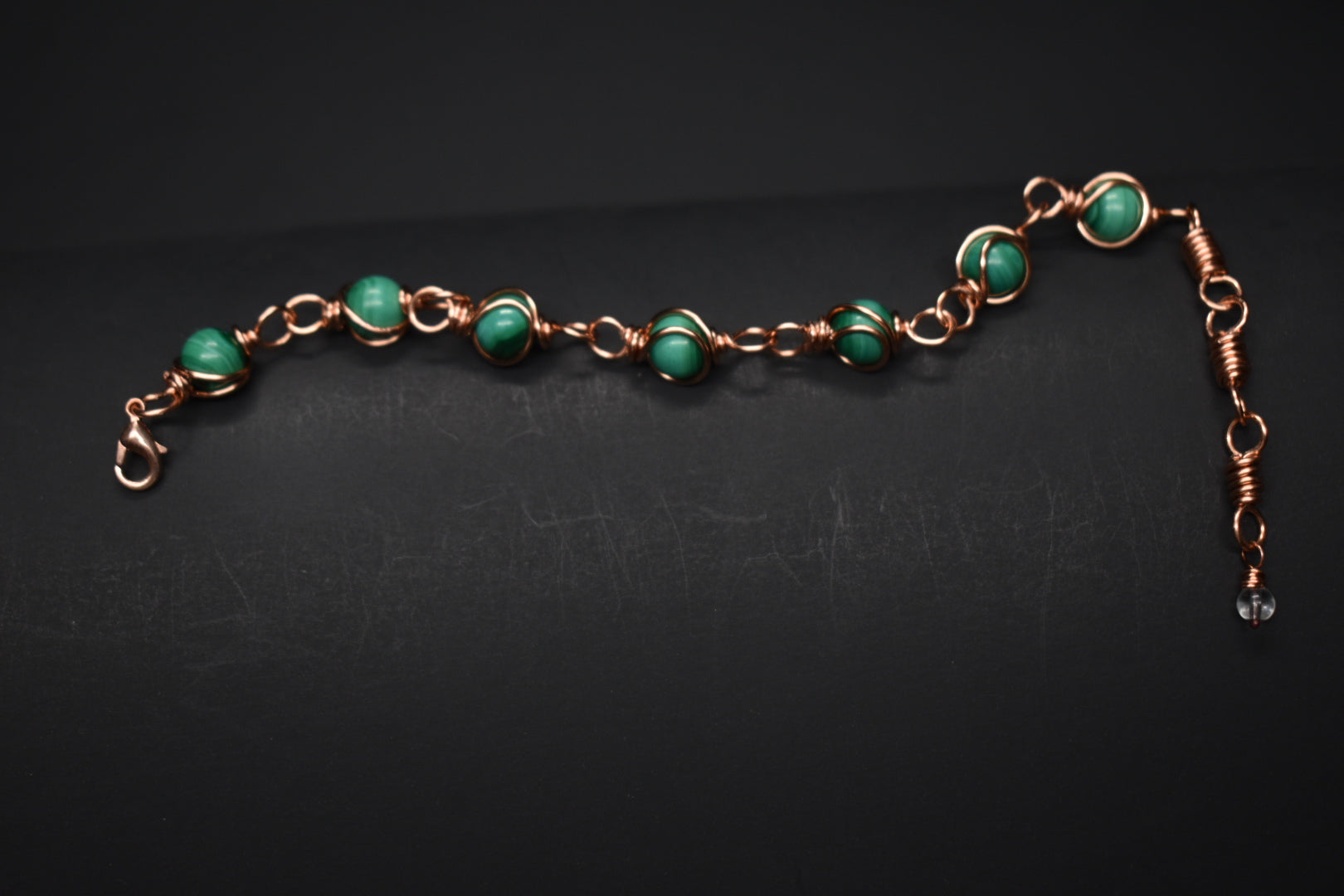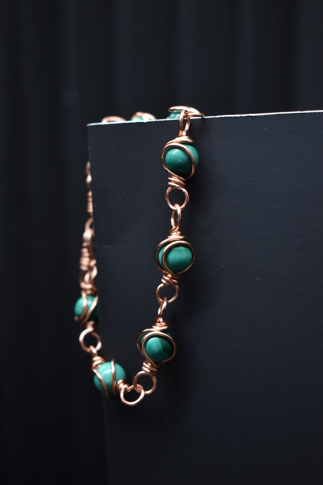The Copper Orbit Bracelet is a dance of spheres and spirals, linked together in a flowing circuit of radiant metal. Each bead rests in its own orbit, held by hand-forged copper wire, creating a rhythm of balance and motion around the wrist.